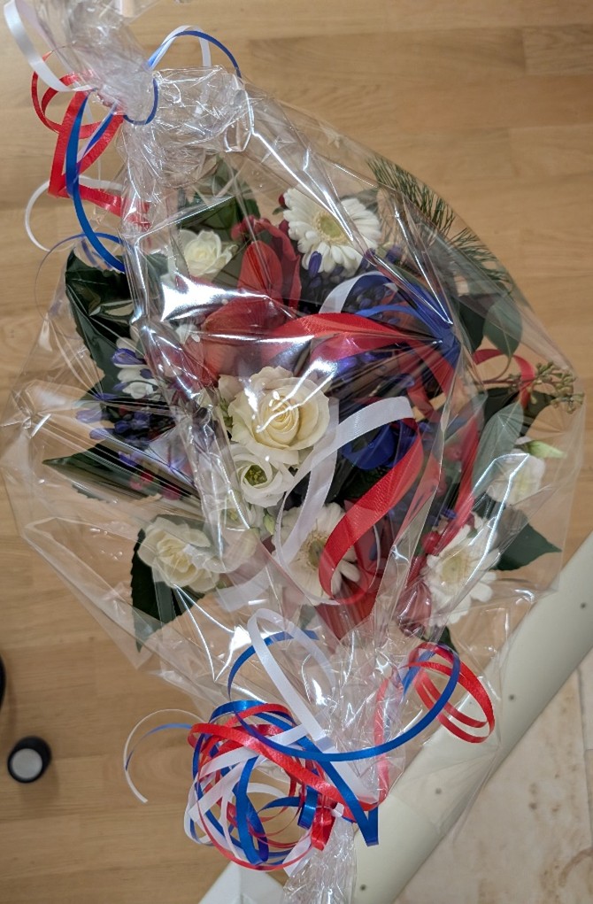 En résumé, une soirée tout à fait réussie pour notre Comité de jumelage, placée sous le signe de l’amitié franco-allemande. Pour terminer, Elizabeth Eder, notre Présidente, remit un bouquet aux couleurs de la France à la chanteuse et des bouteilles de Beaujolais aux musiciens, mais aussi à Matthias Lange en remerciement de leur engagement et de leurs prestations à l’occasion de cette belle soirée, sans oublier de remercier chaleureusement toutes les personnes qui ont aidé et participé à l’organisation de cette représentation que nous ne manquerons pas de reproduire l’année prochaine.